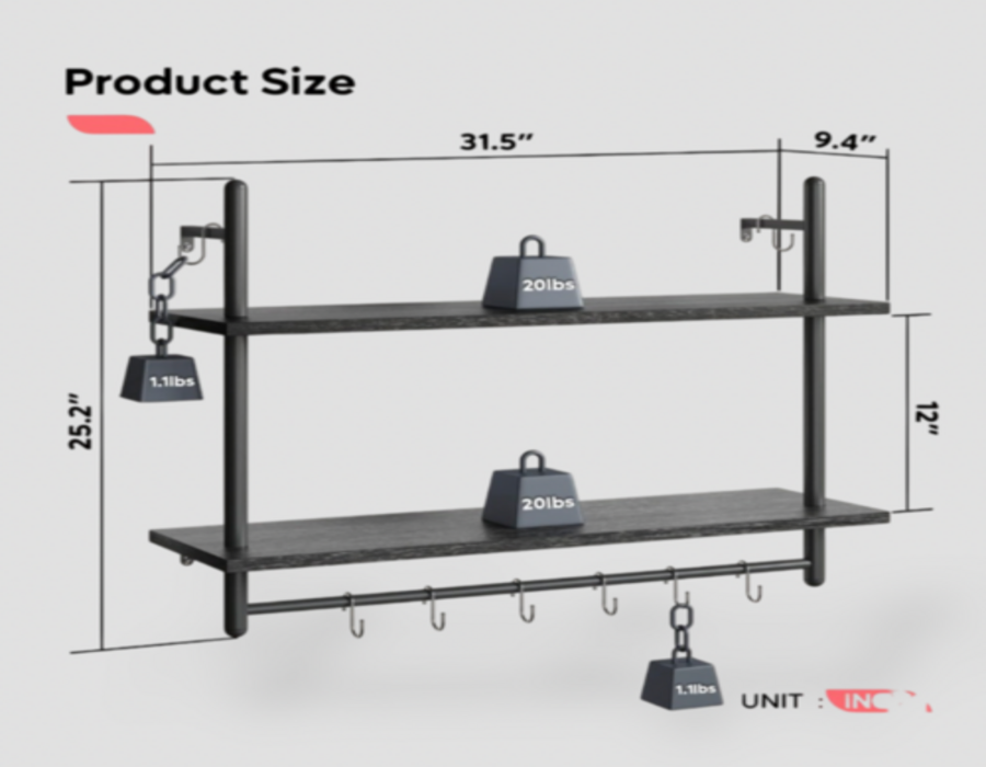 The Bestier Pipe Shelf Industrial Floating Shelving combines functionality and style with its robust design and versatile features. This 31" wall-mounted shelf is ideal for use in kitchens, bathrooms, living rooms, or coffee bars. It includes a towel bar, hooks, and a coffee bar rack, making it perfect for storing and displaying towels, books, plants, or kitchen essentials. The charcoal black finish adds a modern industrial touch, while the sturdy steel pipe construction ensures long-lasting durability and stability.