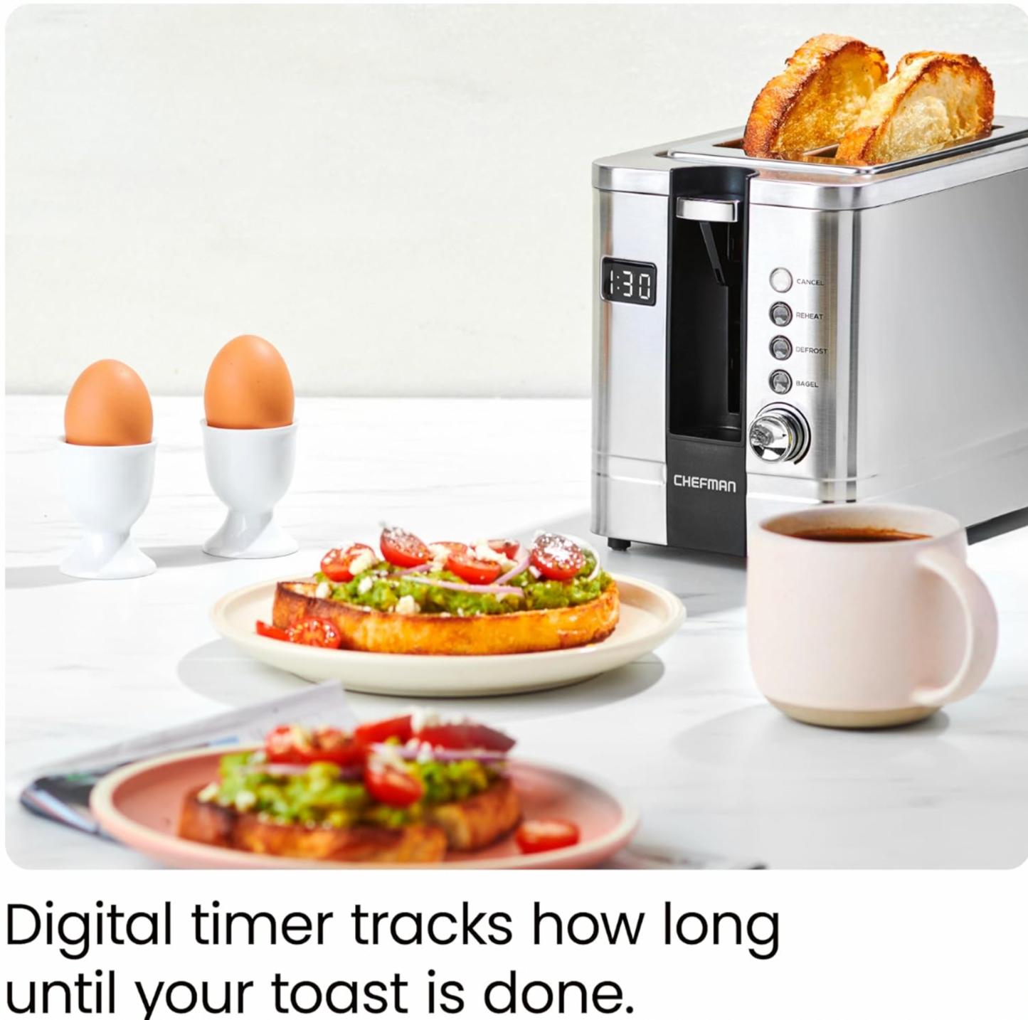 Chefman 2-Slice Digital Toaster – Stainless Steel, Extra-Wide Slots, Defrost/Reheat/Cancel, Removable Crumb Tray