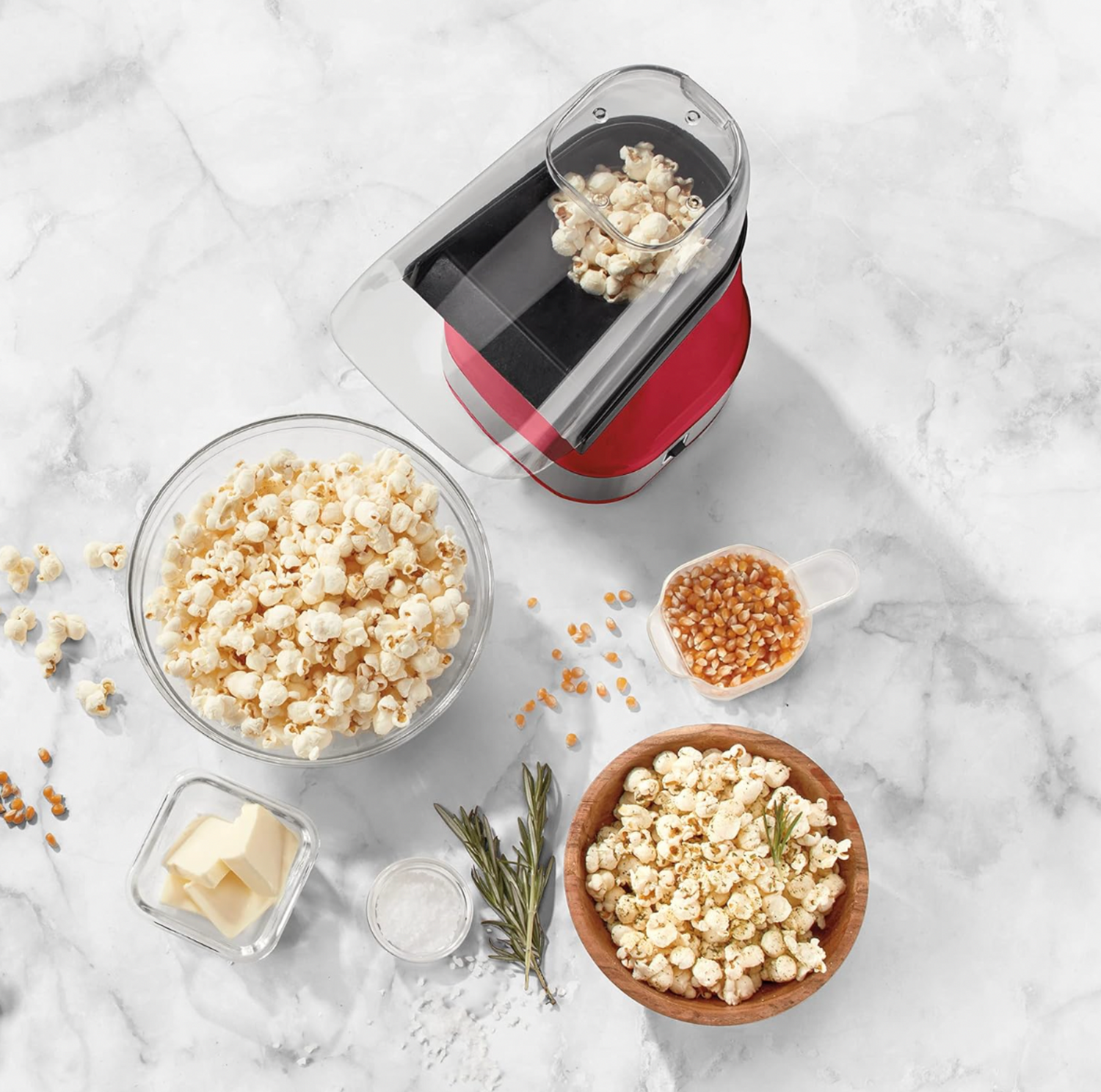 • Included: Popcorn maker, removable chute, kernel measuring cup