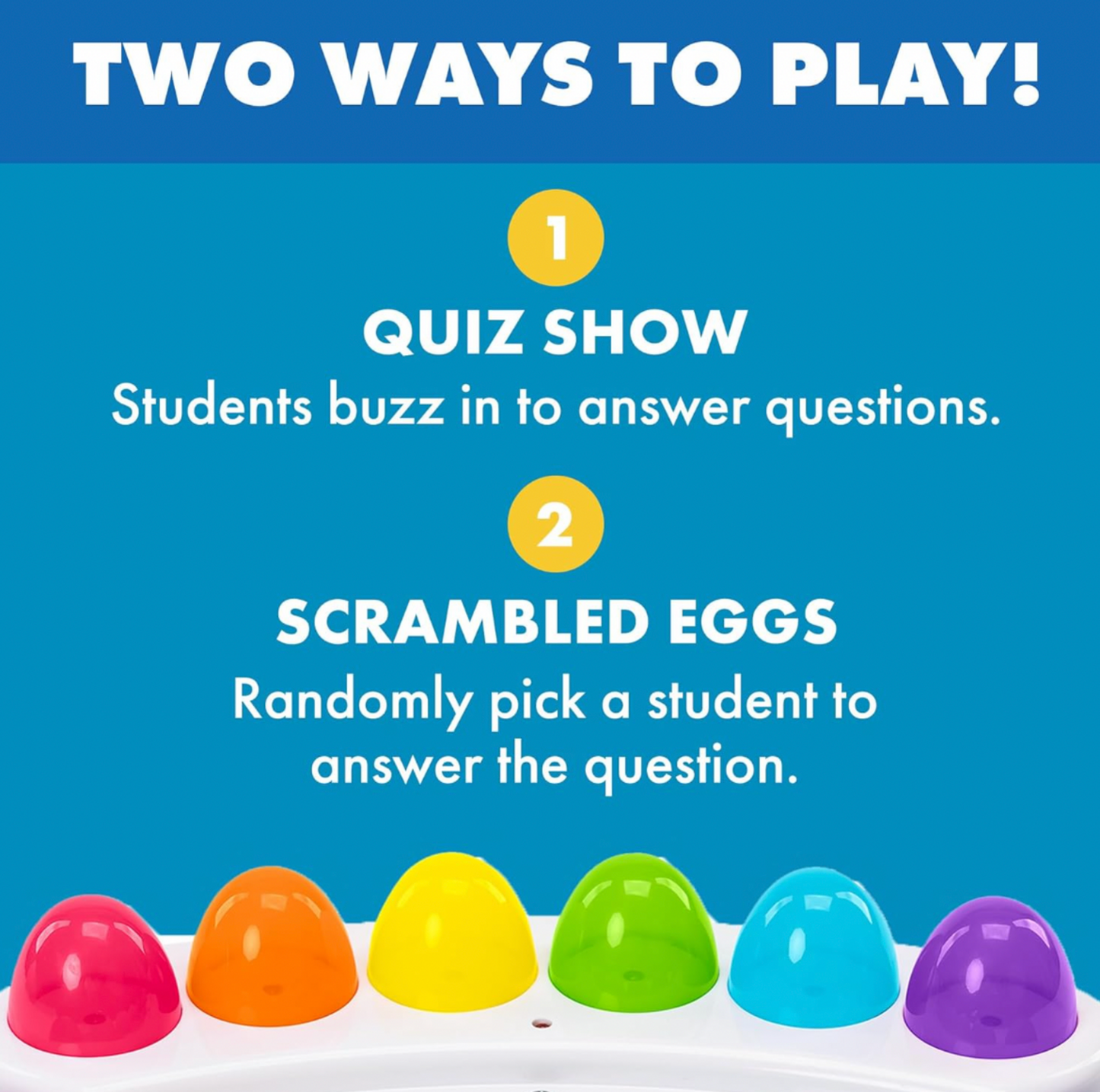 - Modes: "Quiz Show" mode for buzzer responses and "Scrambled Eggs" mode for random student selectionIncluded Accessories: 1 Wireless Eggspert unit, 6 wireless student buttons, wireless teacher remote, user guide