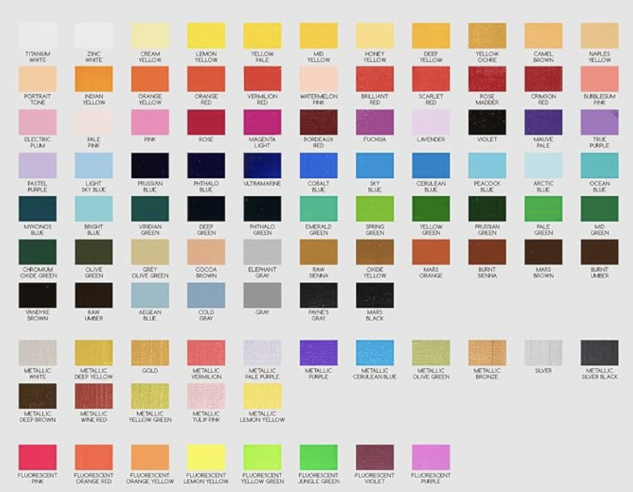 Includes 100 acrylic paint tubes (12 ml), 10 brushes, 2 stretched canvases, 3 canvas panels, and 2 palette knives
