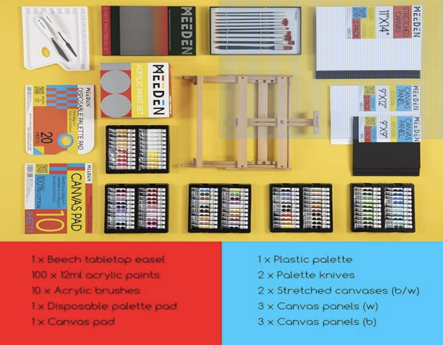 MEEDEN Acrylic Paint Set – 100 Colors, Wood Easel, Brushes & Canvases