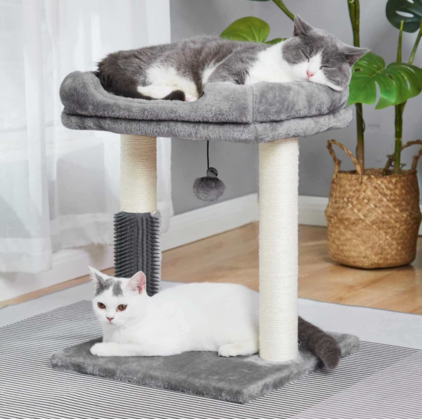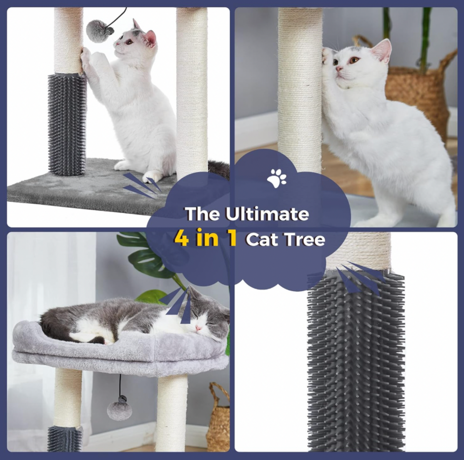 - 4-in-1 Design: Includes a scratching post, self-groomer, top perch, and dangling ball for entertainment and comfort