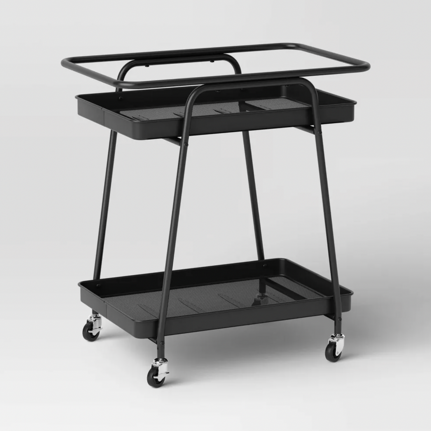 Elevate your outdoor entertaining with the Metal Mesh Rolling Patio Bar Cart. Made of rust-resistant galvanized steel in a sleek black finish, it features a top shelf, a mesh bottom shelf, and four caster wheels for easy mobility. Perfect for serving drinks, snacks, and more, its industrial design blends functionality and style. Tools are provided for assembly.
