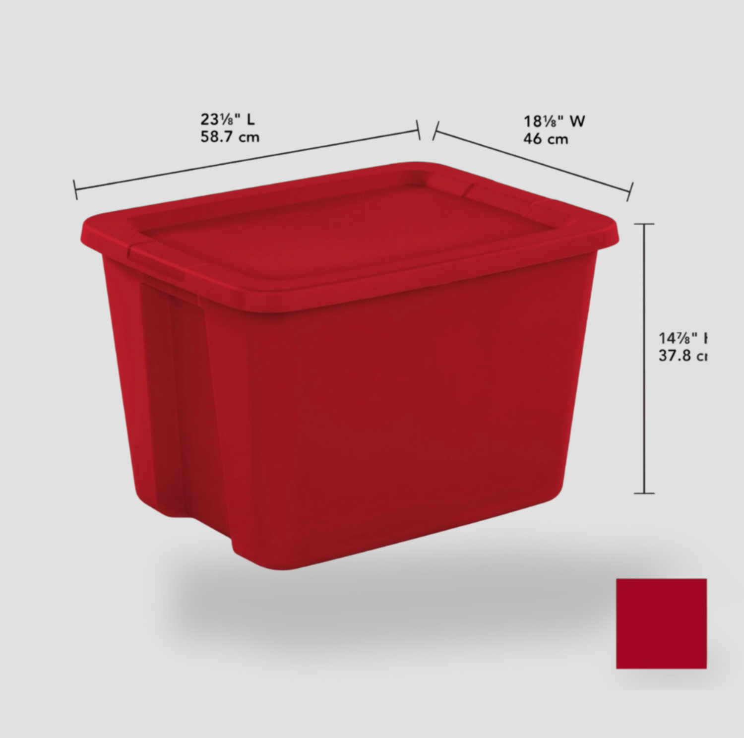 Keep your home organized with the Sterilite 18-Gallon Tote Box in Red. This versatile and durable storage solution is perfect for clothing, toys, linens, seasonal decorations, and more. The opaque base keeps contents out of sight, while the secure snap-on lid ensures everything stays contained. Integrated textured handles provide a comfortable grip for easy carrying, and the deep recessed lid allows for secure stacking to maximize storage space.